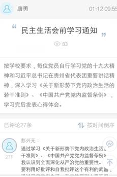 1月12日,资环学院教工支部在易班平台组织了学习十九大精神和习近平总书记在贵州省代表团重要讲话精神,学习《中国足球彩票新形势下党内政治生活的若干准则》和《中国共产党党内监督条例》。同时在易班平台开展了对标党章活动(易班平台截图如图1所示)。同时在易班平台开展的还有对标党章活动。