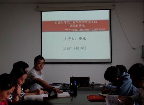 为深入学习贯彻习近平新时代中国特色社会主义思想,2018年09月19日中午13:30,我院学生党支部在行政楼603会议室积极开展了“牢记嘱托·感恩奋进”的主题读书活动,资环学院学生党支部全体党员参加了此次活动,活动由李永老师主持。