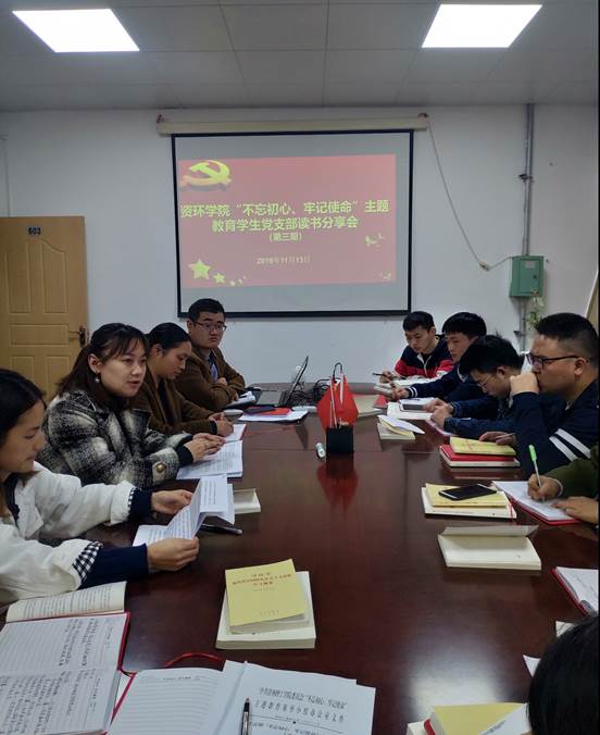 2019年11月13日中午,资源与环境工程学院学生党支部在主楼603室组织开展了“不忘初心、牢记使命”主题教育学生党支部读书分享会,学院党总支副书记梁珍老师以及所有学生支部党员参加此次活动,会议由学生党支部书记李永老师主持。