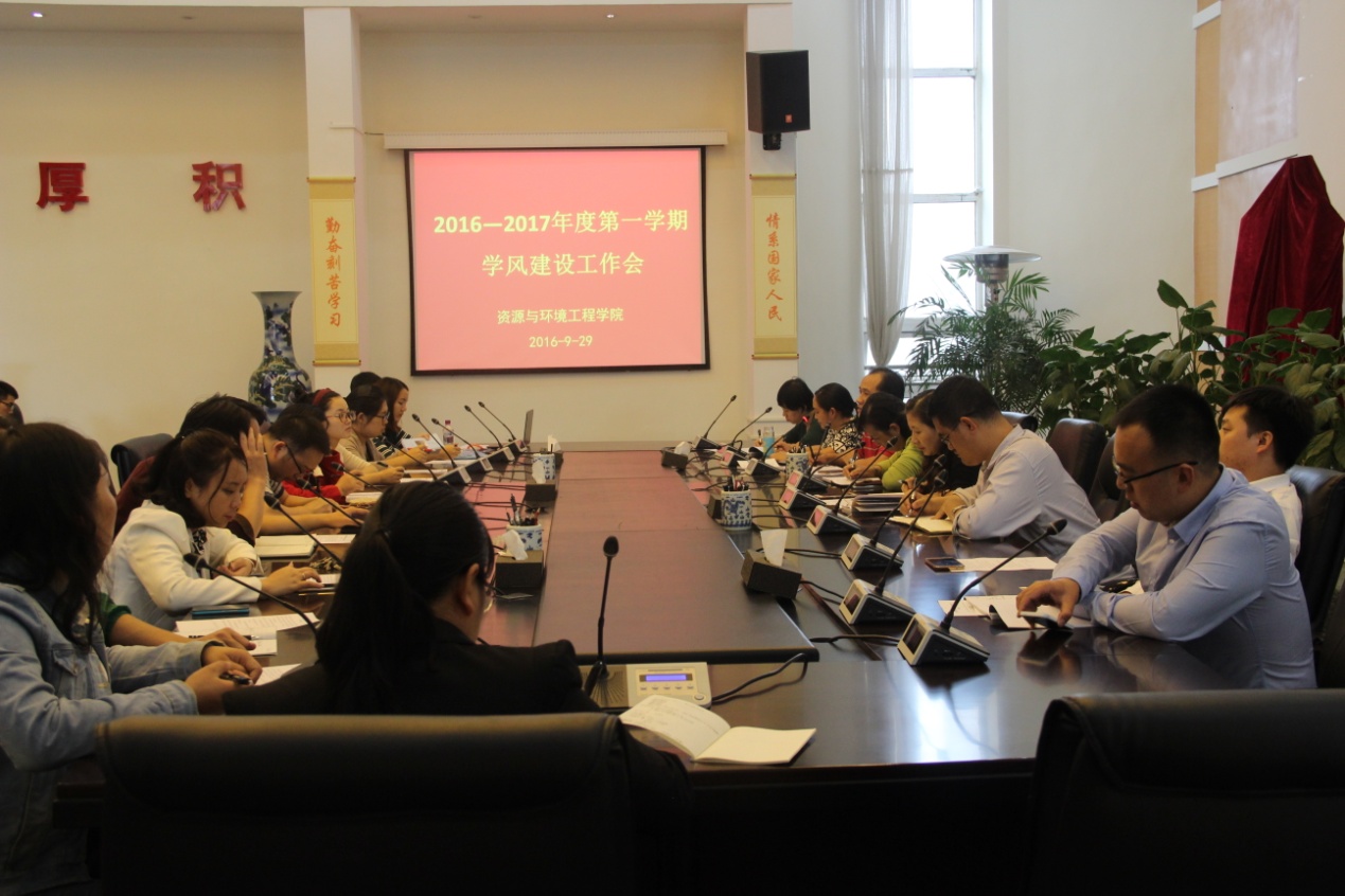 2016年9月29日中午,资源与环境工程学院在喀斯特会议厅组织召开了2016-2017学年第一学期学风建工作会议。学院全体领导、学生科、教务科、辅导员、班主任、学生党员及入党积极分子、各班班长、学习委员以及学生会纪检组同学参加会议,会议由学院党总支副书记吴维义主持。