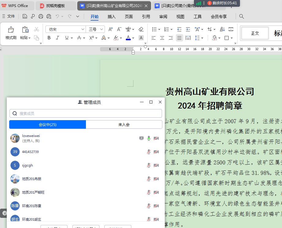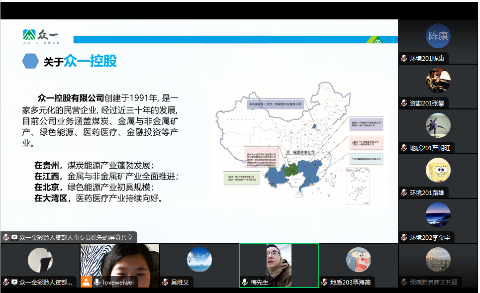 因大部分2024届毕业生正处实习阶段,本次招聘会采用线上方式进行。有5家企业参加本次招聘会,分别是贵州众一金彩黔矿业有限公司、贵州高山矿业有限公司、贵州众诚天河水利工程有限公司、广东中顺油田工程技术服务有限公司、水利电力研究院。