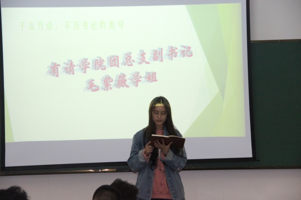 班会开始,资环学院团总支副书记毛紫薇为同学们详细的介绍了做为一名共青团员应该如何去学习遵守党的章程、做一名合格优秀的四有青年。
