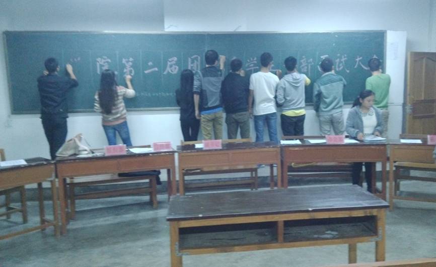 2014年10月14日19:00-21:00,资环学院团总支在1教402进行招新。早在18:00左右,团总支副书记及各部门成员便来到面试地点布置会场,黑板上整整齐齐的写着“资环学院第二届团总支学生干部面试大会”。