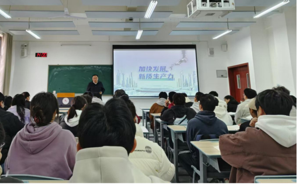 课堂上,潘校长以丰富的案例展开教学。在谈到新质生产力在农业方面的体现时,他从古代传统的农耕方式,到现代农业借助高科技手段所实现的巨大变革,娓娓道来,生动详实的阐述了生产力发展的脉络。不仅如此,他还结合自身的经历,将抽象的理论变得更加通俗易懂,使同学们能够深刻地感受到新质生产力对社会发展的重要意义。
