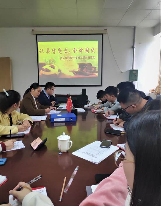 2019年11月8日,资源与环境工程学院学生党支部在主楼604室组织开展了“认真学党史、新中国史”主题党日活动,所有学生党支部党员参加此次会议,会议由学生党支部书记李永老师主持。