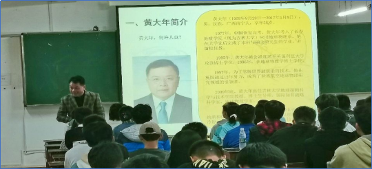 聂爱国教授给同学们介绍了黄大年先生的生平简介,让大家进一步认识到“心怀爱国志,笃行报国志”是黄大年最好的写照。