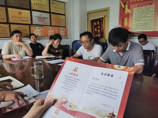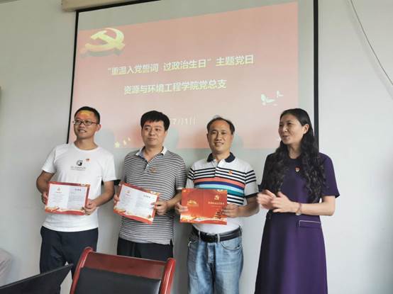 活动分为以下六个阶段,首先全体起立,奏唱国歌;然后吴维义同志带领全体党员重温了入党誓词;紧接着由资源与环境学院副院长李桂贤向吴维义、刘坤、姜伏伟三位同志赠送“政治生日”贺卡。接下来,这三位同志宣读了当年的《入党志愿书》、回顾入党初心、并围绕自己的入党初心就如何做一名优秀的共产党员谈了体会。