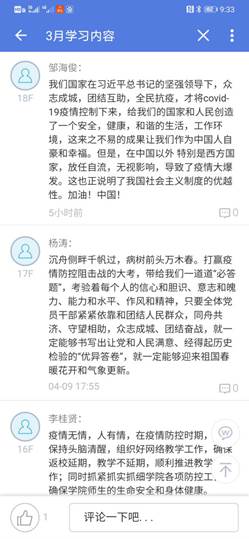 活动共有四环节:第一,唐勇同志带领大家学习杨荣、黄和艳两位同志的先进事迹;第二,在易班平台学习习近平总书记在武汉视察新冠病毒疫情的讲话精神,并发表学习心得;第三,唐勇同志领学贵理工党发[2020]17号和21号文件精神;第四,党员代表刘伟、杨悟及总支书记吴维义同志分别进行了发言。最后唐勇同志作了总结,他指出了学习先进的重要性及党内监督的重要性,并号召全体党员要做好本职工作,为全面战胜疫情及脱贫攻坚贡献一份力量。