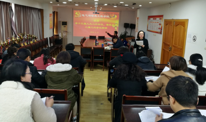 本网讯(电气与信息工程学院 刘帆)3月15日下午,电气与信息工程学院党总支在723会议室召开省十三届人大二次会议、省政协十二届二次会议(以下简称省“两会“)精神学习会,由党总支书记王婷婷带领学习会议精神,学院全体在家领导班子成员和全体教职工参加。