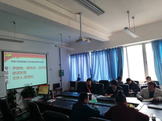 根据学校相关文件精神,11月27日上午,机械工程学院教师党支部组织开展以“学精神、做先进、迎评促建谋发展”专题党课,此次党课由院长陈海虹主讲,全体教师党员参加了学习。